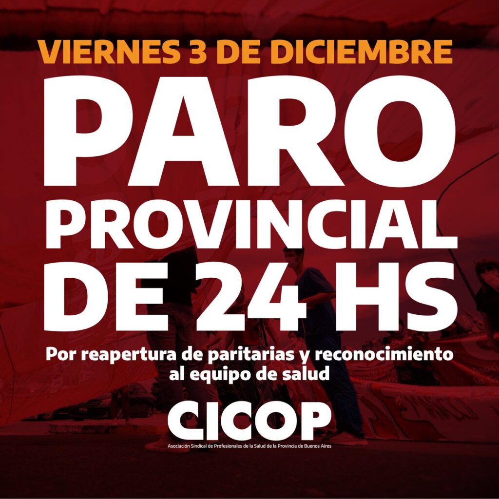 La Asociación Sindical de Profesionales de la Salud (Cicop) bonaerense realiza este viernes un paro de 24 horas con movilización hacia la ciudad de La Plata, en demanda de «la reapertura de la negociación paritaria«, informó el gremio.