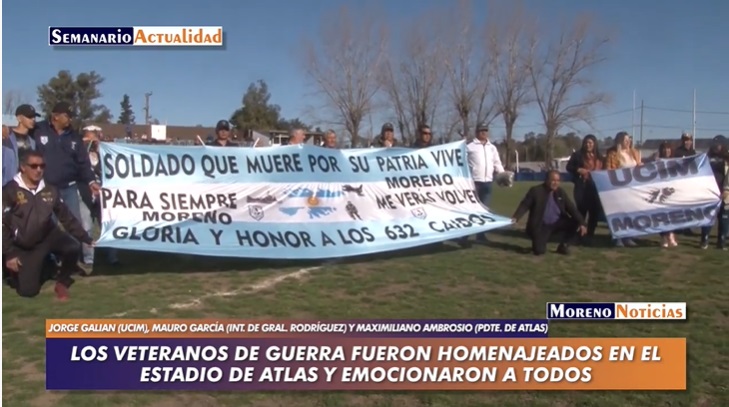 En el entretiempo del partido disputado entre Atlas y Puerto Nuevo, se realizó un homenaje a nuestros héroes de Malvinas. Sonó la trompeta de Omar Tabares. Reconocimiento de las dos parcialidades. Palabras de Jorge Galián (Unión de Combatientes de las Islas Malvinas de Moreno), Maximiliano Ambrosio (presidente de Atlas) y Mauro García (intendente municipal de General Rodríguez)