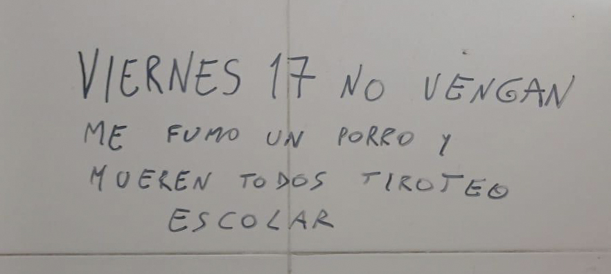 Un reto en las redes sociales, principalmente en TikTok, generó alarma cuando comenzó a difundirse en las comunidades educativas. En algunas escuelas aparecieron pintadas en los baños, advirtiendo sobre un tiroteo programado para este viernes 17 de abril. Las fotos se viralizaron, algunas acompañadas de videos y listados de supuestas víctimas. Las imágenes mostraban armas e incluso una persona portando una pistola frente a una institución no identificada.