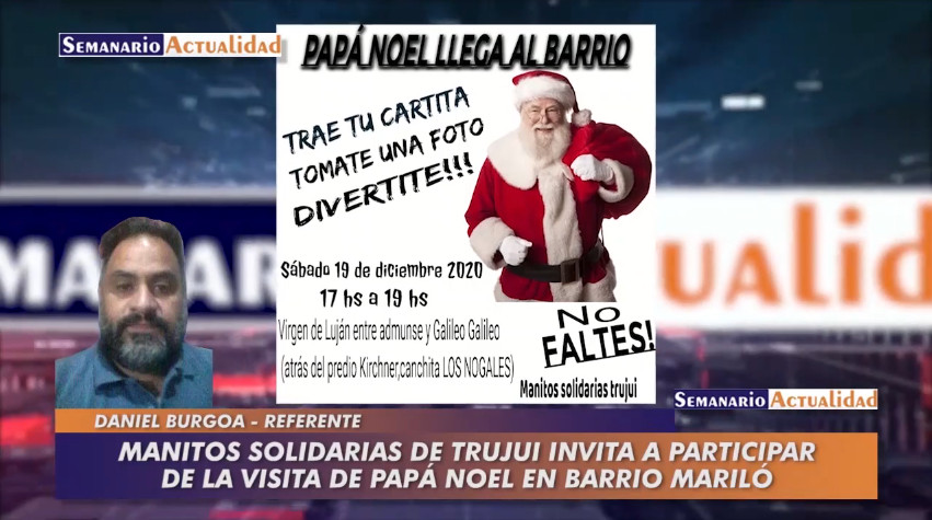 SociedadManitos Solidarias de Trujui invita a participar de la visita de Papá Noel en barrio Mariló Posted on 17 diciembre, 202017 diciembre, 2020 by rodrigos 17 Dic Entrevista con Daniel Burgoa, referente ATE Moreno entrega un bolsón navideño con productos frescos para sus afiliados Casi cinco mil inscriptos en la UNM para el inicio del ciclo lectivo 2021