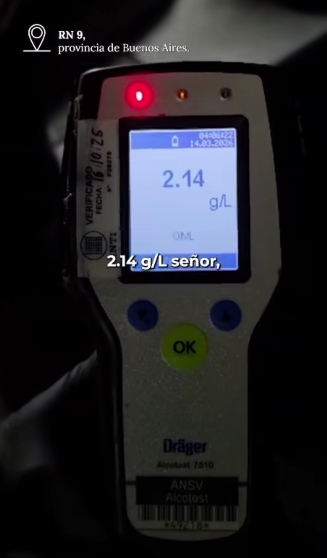 La otra alcoholemia positiva máxima se registró en Bahía Blanca, mientras que el test de 2,14 g/l ocurrió sobre la Ruta Nacional 9, donde el conductor minimizó la situación al decir que venía de “tomar una copa” en la casa de un amigo.