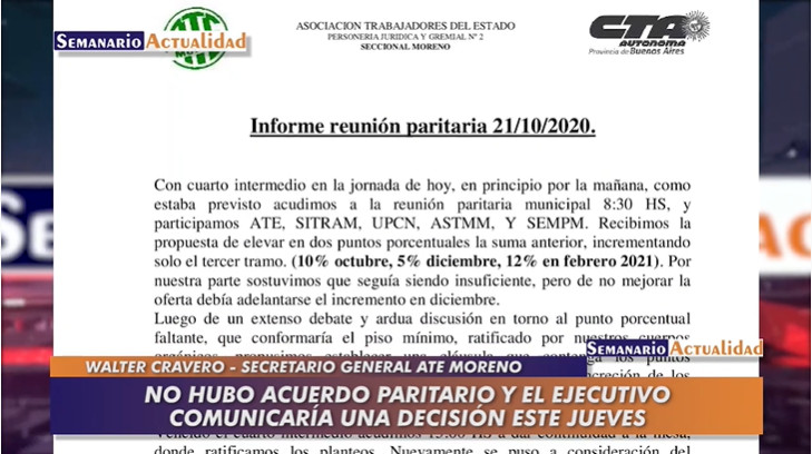 SaludNo hubo acuerdo paritario y el ejecutivo comunicaría una decisión este jueves Posted on 22 octubre, 202022 octubre, 2020 by rodrigos 22 Oct Entrevista con Walter Cravero, secretario General de ATE Moreno El HCD de Moreno aprobó el proyecto de Ordenanza gestado por músicos independientes locales A 16 años de la ley, la búsqueda de hijos de desaparecidos no se detiene