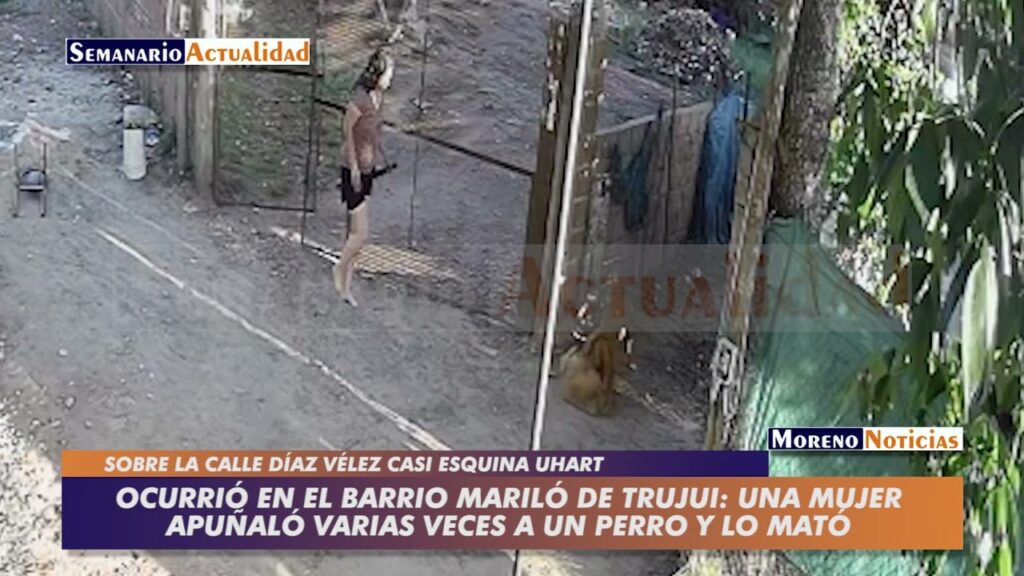 Imágenes sensibles. Dos perros peleaban en la mañana del lunes 3 de noviembre cuando una mujer salió con una cuchilla y mató a uno de los animales. Acto seguido, lo arrastró hasta el fondo de su casa. El suceso se produjo en Díaz Vélez casi esquina María Elena Uhart del barrio Mariló de la localidad morenense de Trujui. La terrible escena quedó registrada en una cámara de video. La denuncia fue radicada en la comisaría Moreno 2º y la causa tramita en la UFI Nº 5 del departamento Judicial de Moreno y General Rodríguez. El fiscal Emiliano Buscalia ya solicitó una serie de medidas que incluye la fehaciente identificación de la agresora.