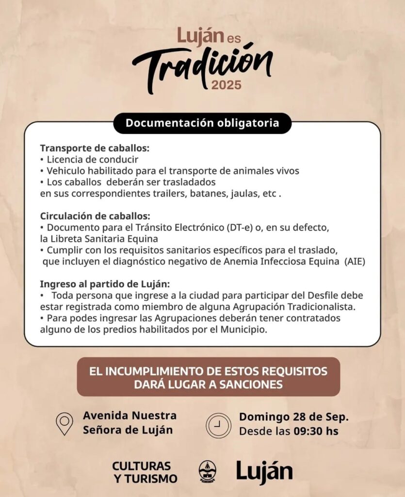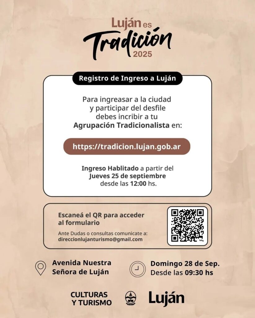 Este acontecimiento al que, junto al Departamento de Cultura y Turismo del Municipio de Luján, llamamos «Luján es Tradición», constituye el evento de concentración equina más grande del mundo. El último Domingo del mes de Septiembre tiene lugar este este festival cultural, que vela y promueve el cuidado de la vida de los animales y los jinetes. Signo de ello es la comunión que nos une a la luz de celebra las tradiciones argentinas, conmemorando la histórica peregrinación a caballo a Luján, cada de la Virgen Gaucha.