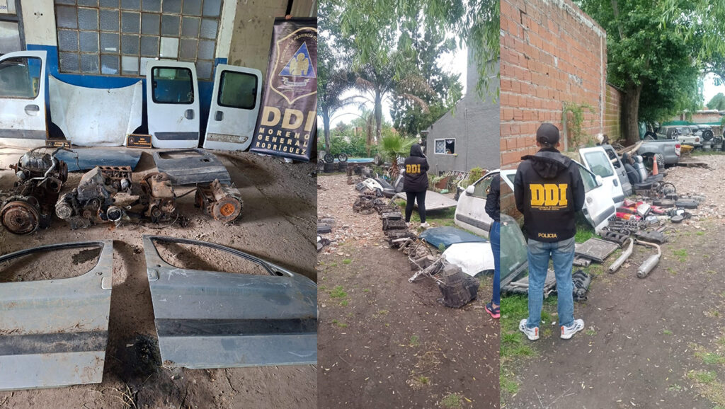 Además, los investigadores encontraron una importante cantidad de autopartes —muchas de ellas con numeraciones suprimidas— que corresponderían a distintos hechos de robo y hurto registrados entre 2016 y 2025. Entre los objetos incautados hay motores y puertas de vehículos con identificaciones que remiten a causas en Moreno, General Rodríguez, La Matanza, Lomas de Zamora y Malvinas Argentinas.