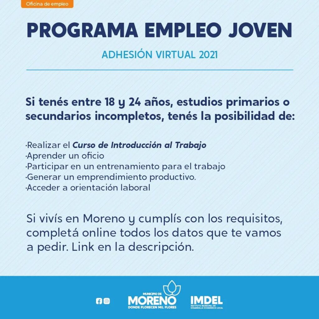 El Municipio de Moreno junto al Ministerio de Trabajo, Empleo y Seguridad Social de la Nación, acercan el PROGRAMA EMPLEO JOVEN 2021 a la comunidad de Moreno.
