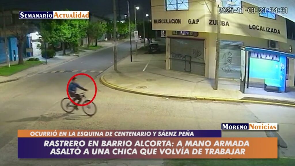 El suceso se registró a las 23:34 de este lunes 3 de noviembre en la esquina de Centenario y Sáenz Peña del barrio Alcorta, Moreno sur. Una chica volvía de trabajar en bicicleta cuando fue asaltada por un sujeto armado. La despojó del vehículo, del dinero y del teléfono celular. Parte de esta secuencia, que duró menos de un minuto, no puede visualizarse; sí cuando la víctima huye despavorida. Los vecinos denuncian insistentemente la falta de seguridad en la zona.