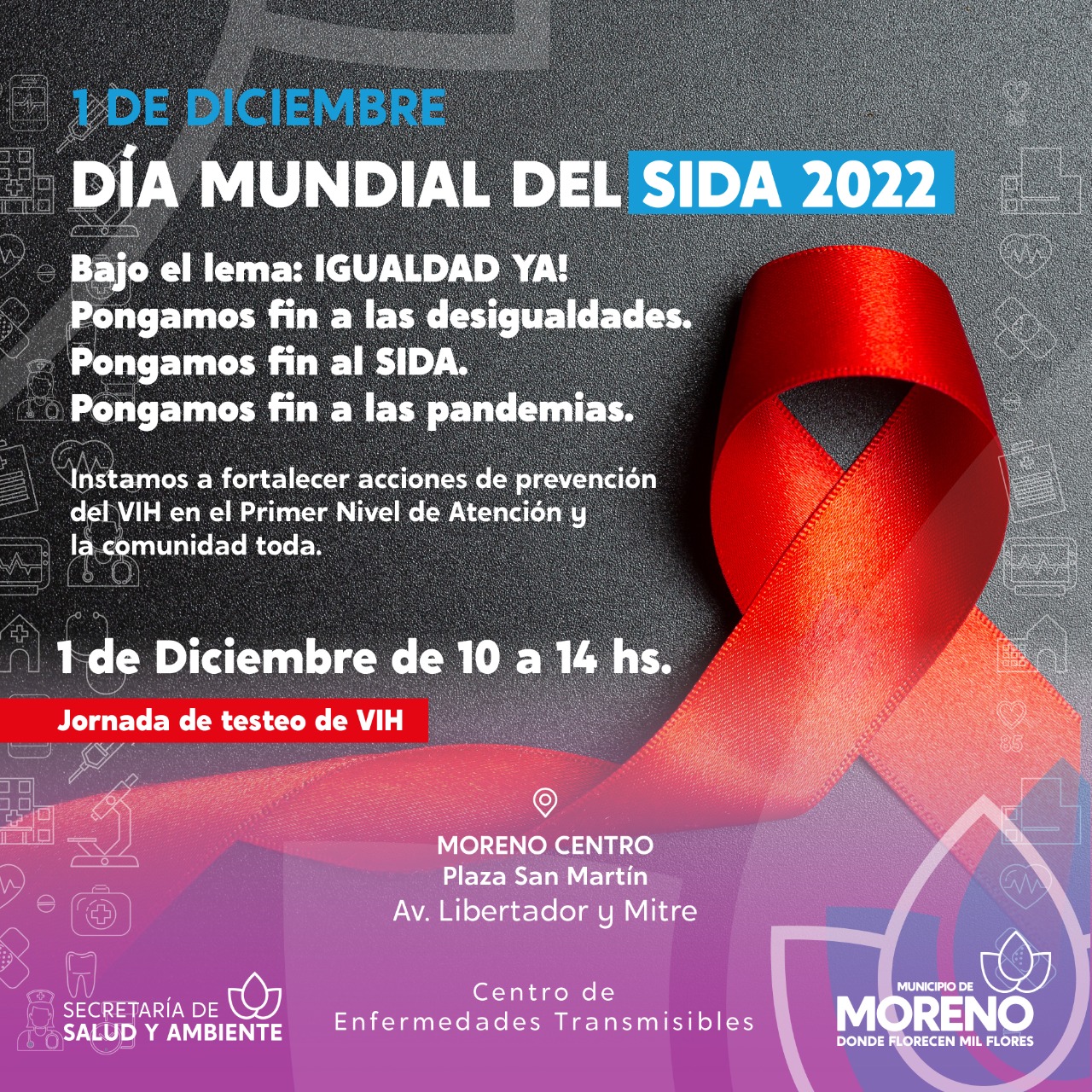 En el marco del Día Internacional de respuesta al VIH/SIDA y bajo el lema “¡Igualdad ya!”, el Municipio de Moreno, a través de la Secretaría de Salud y Ambiente, llevará a delante una jornada de testeos rápidos de HIV, el día jueves 1 de diciembre en la plaza San Martin, de 10 a 14 horas.