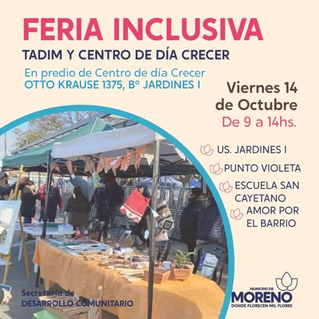 El municipio de Moreno, a través de la Secretaría de Desarrollo Comunitario, desarrollará la Feria Inclusiva este 14 de Octubre, de 9 a 14 horas, en el predio del Centro de Día Crecer, ubicado en Otto Krause 1375, Barrio Jardines I.