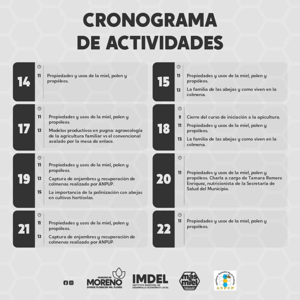 Organizado en diferentes puestos de venta, se abordarán también temas como las propiedades y el uso de la miel, el polen y los propóleos; los modelos productivos agroecología de la agricultura familiar versus el convencional; captura de enjambres y recuperación de colmenas, además de la importancia de la polinización con abejas en cultivos hortícolas. En el encuentro se contará con la presencia de Tamara Romero Enriquez, nutricionista de la Secretaria de Salud del Municipio.