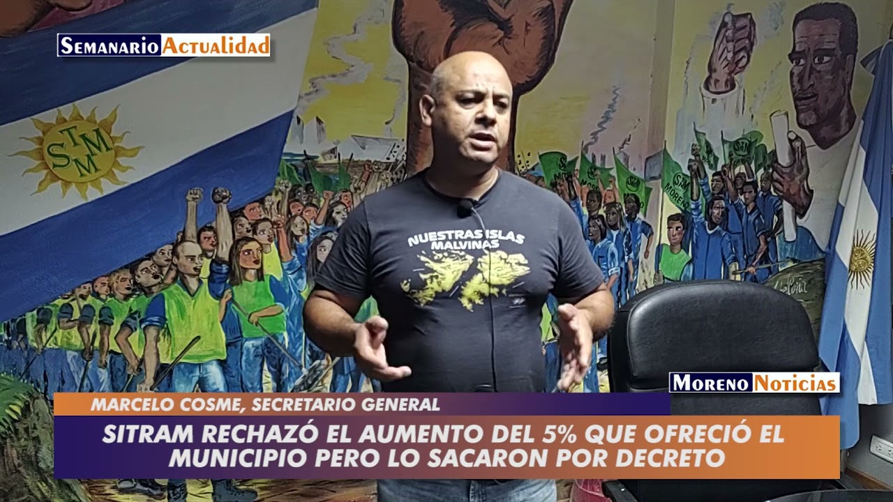 El Sindicato de Trabajadores Municipales de Moreno (SITRAM) rechazó la propuesta paritaria del gobierno municipal. El ejecutivo propuso un 5% de incremento salarial correspondiente a diciembre, pagadero a mediados de enero próximo. Esta aumento fue rechazado por los gremios mayoritarios, por considerarlo insuficiente. Este 2025 la actualización de los sueldos fue del 33.40%. Entrevista con Marcelo Cosme, secretario General de SITRAM hasta este 10 de diciembre. Ya asumió formalmente Lorena Costa. El viernes se realizará el acto protocolar.