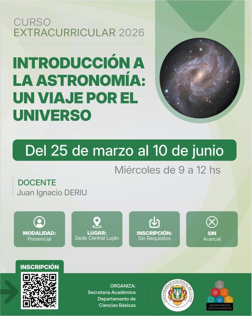 El Departamento de Ciencias Básicas de la UNLu informa que se encuentra abierta la inscripción al Curso Extracurricular «Introducción a la Astronomía: un viaje por el universo», que se desarrollará en modalidad presencial, en la sede Luján, desde el 25 de marzo hasta el 10 de junio de 2026, los miércoles de 9 a 12 horas (12 clases).