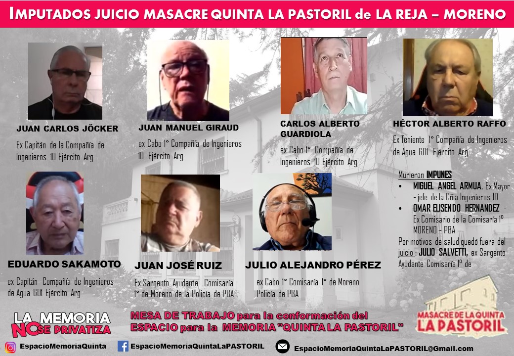 Cuatro condenados a prisión perpetua por delitos de lesa humanidad por los hechos acaecidos en La Quinta La Pastoril de La Reja, partido de Moreno, el 29 de marzo de 1976. Ellos Son Juan Carlos Jöcker, Juan Manuel Giraud, Héctor Raffo y Eduardo Sakamoto. Julio Pérez fue condenado a 19 años y Juan José Ruiz a 20 años de prisión por considerarlos partícipes necesarios. Fue absuelto Carlos Guardiola. El veredicto lo brindó el Tribunal Oral Criminal Federal Nº 5 de San Martín este jueves 13 de octubre y los fundamentos se conocerán el 30 de noviembre. Además los jueces ordenaron que se investiguen las torturas ocurridas en la Comisaría 1º de Moreno durante la dictadura militar. Ampliaremos